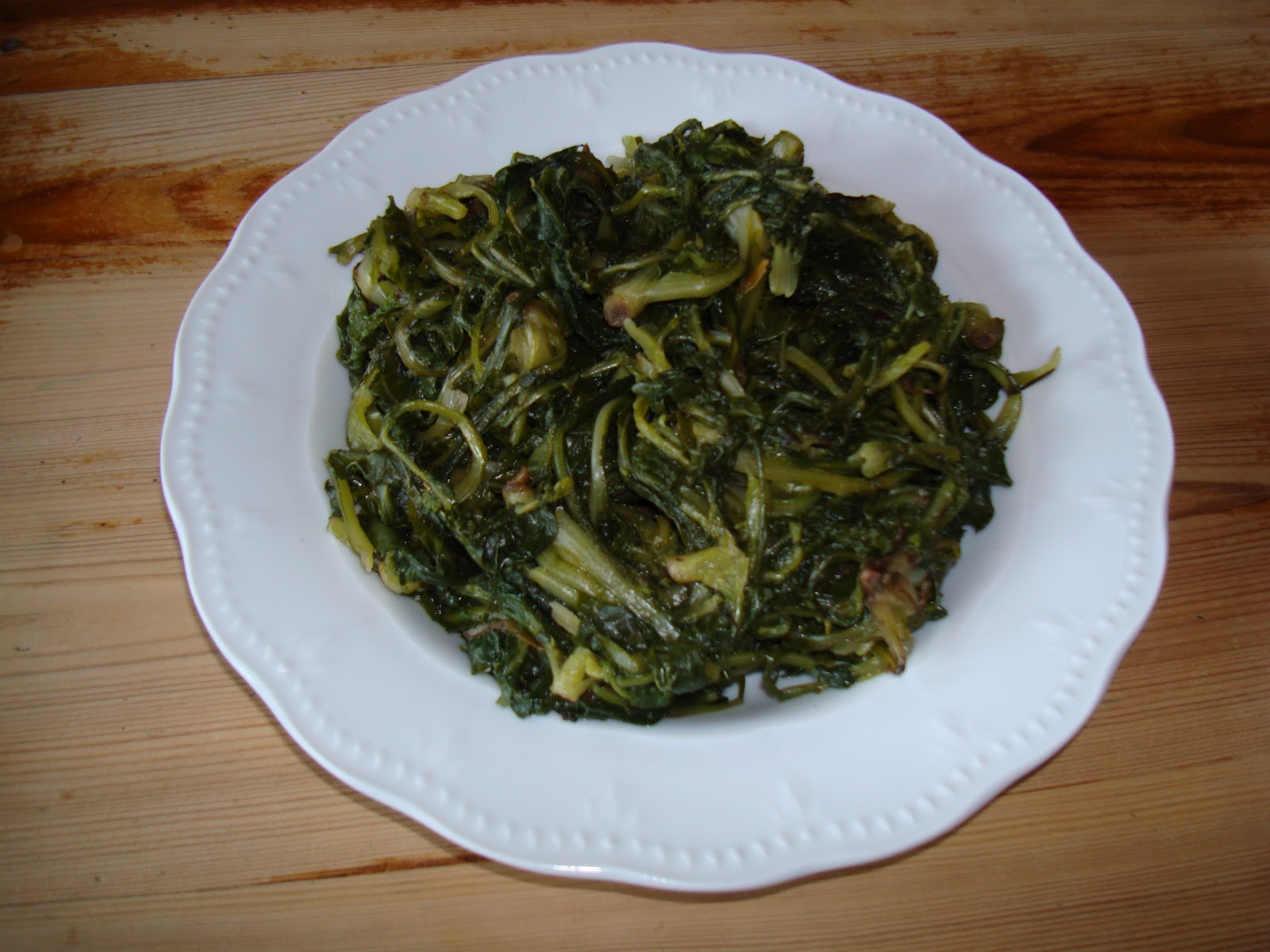 Το γεύμα: βρασμένο χόρτο αγριαγκινάρας από την Κρήτη, ραφιναρισμένο ελαιόλαδο, λεμόνι, ψωμί.
