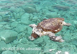 Ταξινομώντας και συσχετίζοντας πληροφορίες από τα αρχεία του Συλλόγου ΑΡΧΕΛΩΝ ανακαλύψαμε ένα τέτοιο παράδειγμα προσανατολισμού. Το 2004 ερευνητές του προγράμματος Ζακύνθου παρατήρησαν μια χελώνα, με άσχημο τραύμα από προπέλα, να γεννάει στο Μαραθονήσι, το νησάκι στον Κόλπο του Λαγανά. Μετά την ωοτοκία οι ερευνητές μετέφεραν τη χελώνα “Brucilla” στο Κέντρο Διάσωσης του ΑΡΧΕΛΩΝ στη Γλυφάδα όπου σε μερικούς μήνες θεραπεύθηκε.