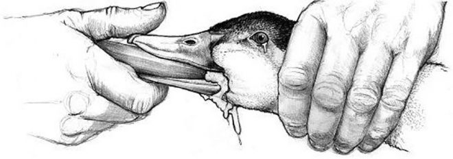 Καταρχήν, ξεχωρίζουν τα αρσενικά από τα θηλυκά. Παίρνουν μόνο τα αρσενικά, αφού και τα θηλυκά έχουν πολύ ιστώδες συκώτι. Τα τελευταία, πετιούνται σε κάδους σκουπιδιών για να πεθάνουν. Στη συνέχεια τους κόβουν με ένα ψαλίδι το ράμφος. Ταυτόχρονα γίνεται μια δεύτερη διαλογή και πολλά ακόμη μωρά-πάπιες ή χήνες πετιούνται στα σκουπίδια. Από τα ζωντανά οι εργαζόμενοι διαλέγουν κάθε μέρα τα μικρότερα και τα σκοτώνουν επιτόπου με κλωτσιές ή απλά κοπανώντας τα στο πάτωμα. Τα ζώα πεθαίνουν αργά και βασανιστικά.